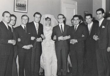 1963. El día de su matrimonio con Gloria Sáenz con sus amigos: Domingo Marzolo (qepd), Salvador Camelio, Kit Pettersen (qepd), Víctor Fernández, Mario Albornoz (qepd), Osvaldo Valdés y Sergio Fernández.